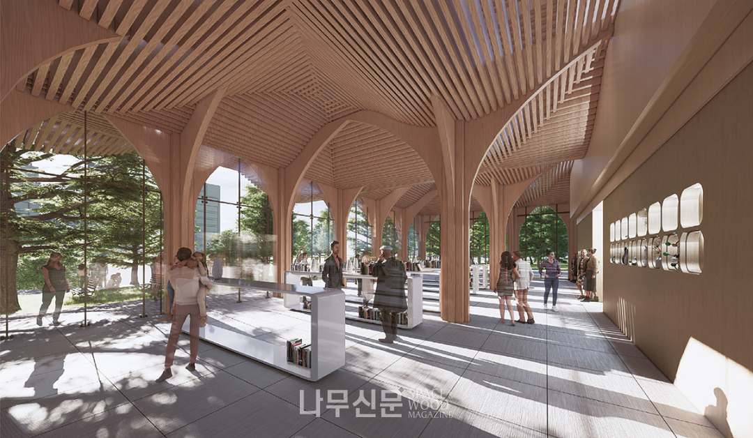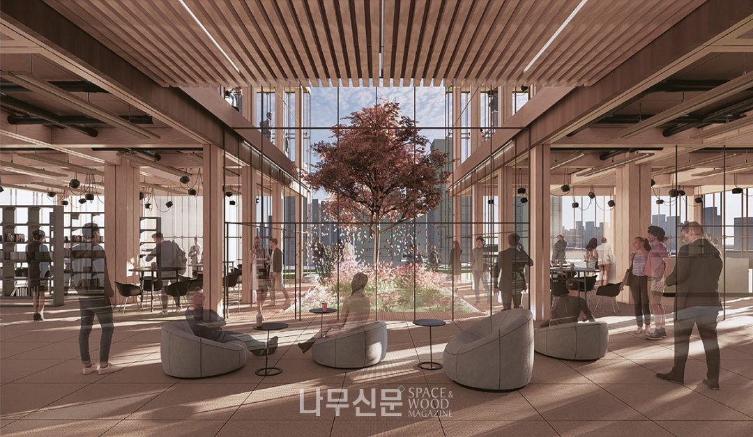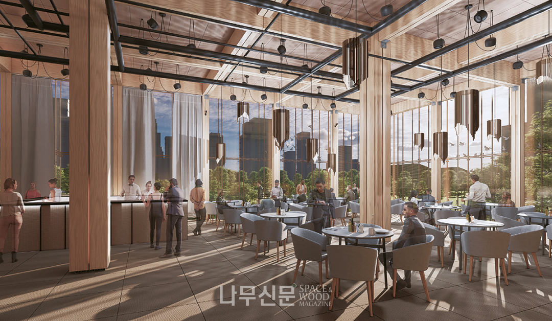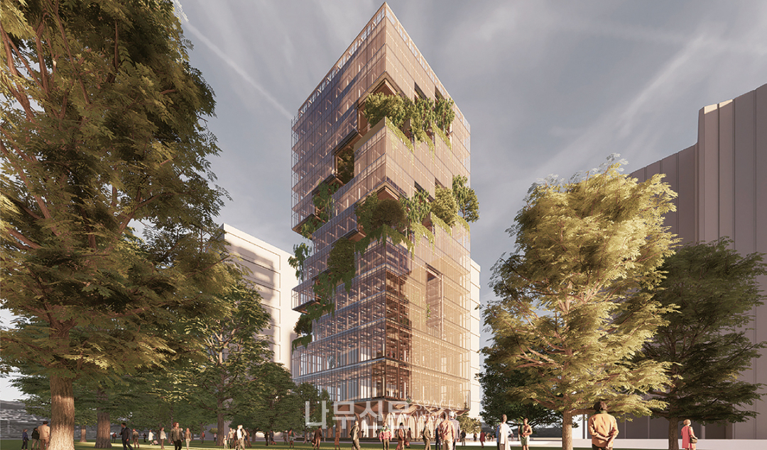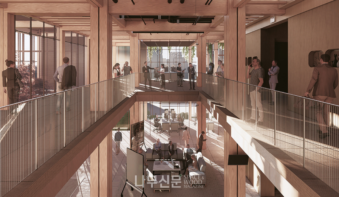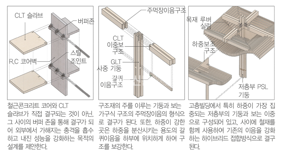 고층의 목구조를 짓기 위해 기초와 코어는 철근콘크리트로 구성하고 그 외 기동, 보, 슬라브 등은 목재로 구성하는 하이브리드 목구조를 제안한다.