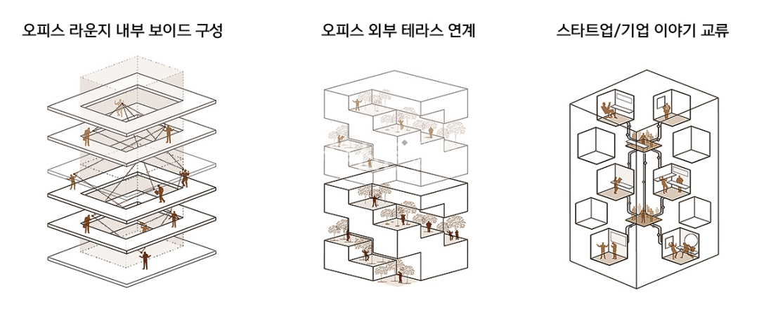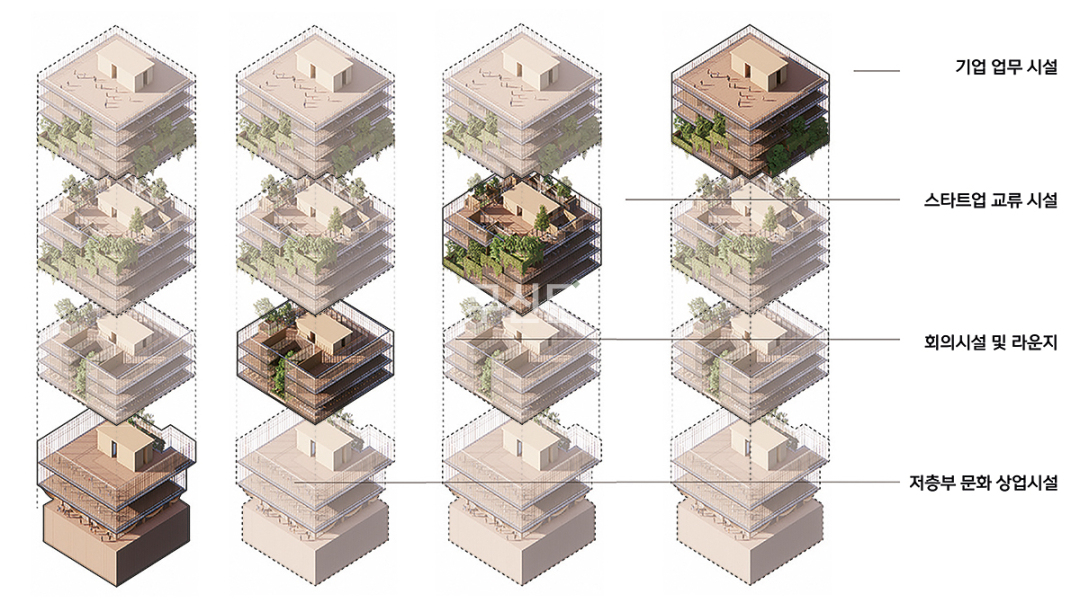 따라서 기업이 입주하는 고층부와 상업 시설 등 공용 문화공간으로 구성된 저층부 사이에 스타트업 업무 교류 시설을 배치하여 저층부에서 부터 ‘공용부-스타트업-입주기업’의 흐름으로 구성하여, 구역마다 교류를 원활하게 한다. 이를 통해서 사용자의 제한 없이 누구나 이용 가능한 복합적인 문화공간뿐만 아니라 도약을 꿈꾸는 스타트업 기업과 기존 테크놀로지 기업의 공동체가 형성된다.