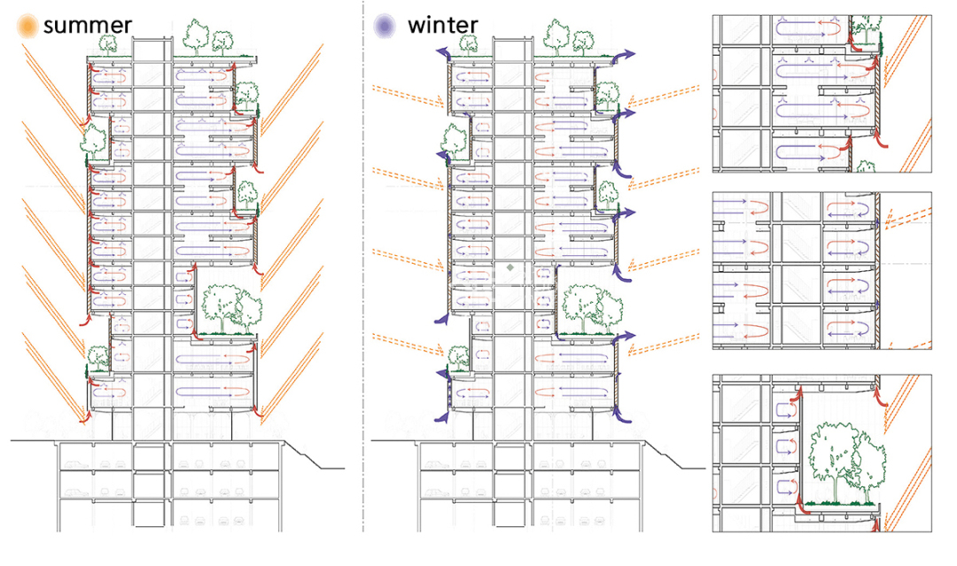 목구조를 통한 친환경성과 더불어 지속가능성을 강화하기 위해 더블스킨 파사드와 그린 파사드, 그리고 목재 슬랫 블라인드를 사용한 설계를제안한다. 커튼월을 이중외피로 구성하여 굴뚝효과를 기대할 수 있다. 또한, 이중외피 사이에 위치한 목재슬랫 블라인드는 겨울-여름, 낮-밤에 변화하는 태양의 고도를 반영하여 에너지 효율을 최적화하는 각도로 유연하게 변화하여 건물의 냉난방 비용을 절감한다. 또한, 그린 테라스로 형성된 그린 파사드는 자연적인 단열 효과를 제공하며, 건물의 생태 발자국을 줄이는 동시에 쾌적한 실내 환경을 조성할 수 있다.