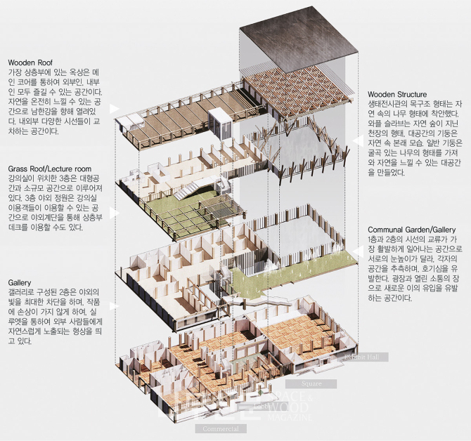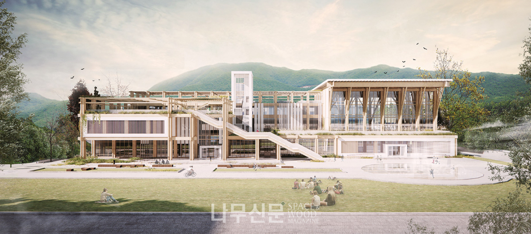 사람들은 격자의 목구조 지붕 아래 놓인 아케이드 같은 광장에서 모이며, 저마다의 시선이 건축과 사람, 자연으로 이어진다.