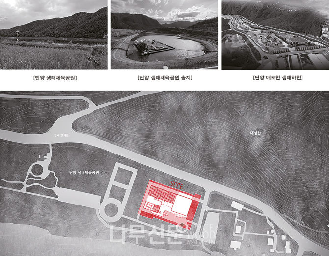 사이트 오른쪽에는 단양 생태 체육공원이 있고, 뒤쪽으로는 산이 있으므로 이를 고려한 매스의 형태와 높이 설정