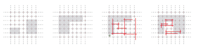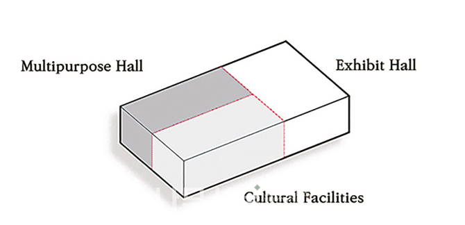 크게 세 가지로 용도를 분류하여 크기 및 구역을 설정하며, 출입 방향을 통한 사용자의 이동 동선을 구획