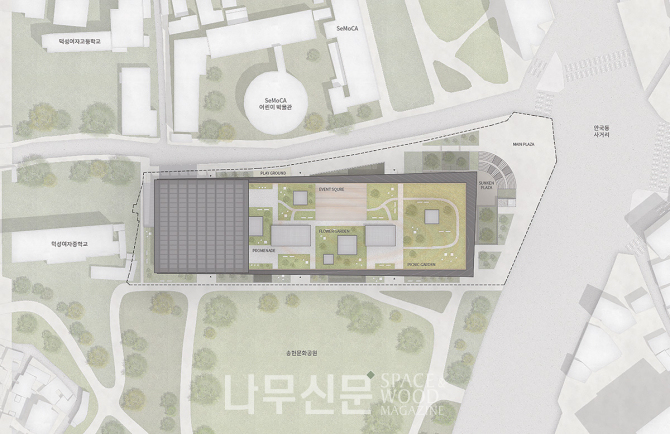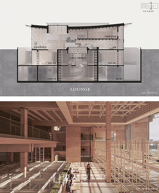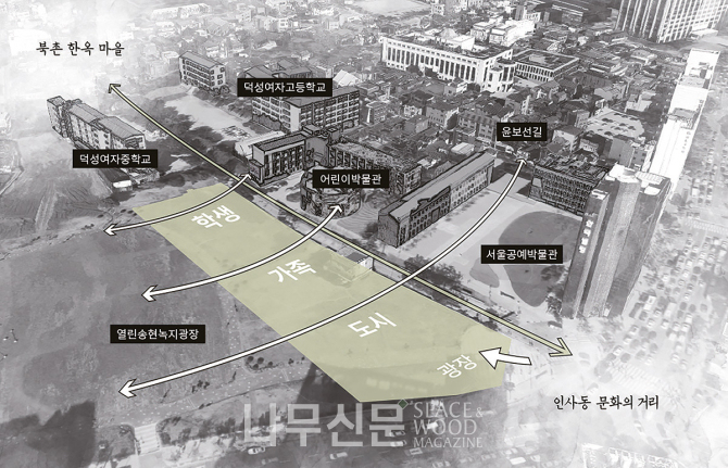대상지는 콘크리트 도심의 자연 공간이다. 이러한 자연 공간에는 시민들을 위한 개방형 수장고와 도서관이 결합된 문화 공간이 건립될 예정이다. 이러한 문화 공간과 자연 공간이 공존될 수 있도록, 하이브리드 목구조 디자인 계획안을 제안한다. 대상지 분석을 통해 인사동과 북촌을 잇는 큰 흐름, 학교로부터 유입되는 학생, 어린이박물관의 가족, 광장에서 윤보선길까지 이어지는 도시의 흐름을 파악하였다. 이러한 흐름은 대상지 주변의 분위기를 형성하는 중요한 요소로 작용한다.