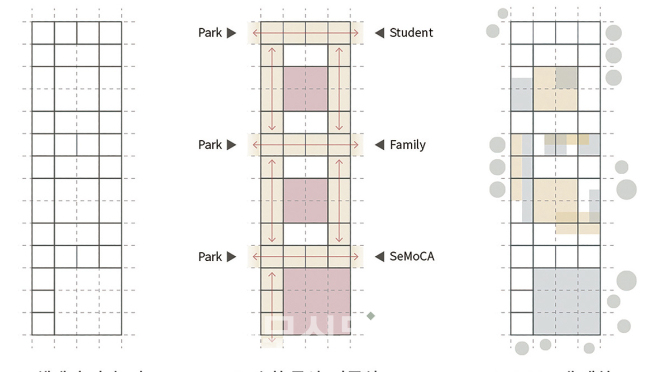대상지 흐름에 의해 형성된 순환 동선과 세 개의 중심은 공간의 위계를 연약하게 만들고 유연한 체계의 기준이 된다.