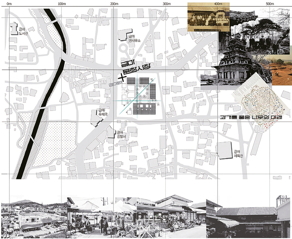 백제 무왕이 천도를 위해 터를 마련한 금마는 경주, 부여 등과 함께 고도지구로 지정된 곳이며 향후 복원이 예정된 지역이다. 1872년 제작된 지방도에 따르면 시장 아래에는 익산 관아가 묻혀있는데, 복원이 시작되면 시장으로서 역사는 사라지게 될 가능성이 크다. 하지만 현재가 없다면 과거와 미래는 이어지지 않는다. 우리는 과거와 미래를 이어주는 시장의 역사가 사라지지 않기를 바랐고, 나무를 통해 관아와 시장을 잇기로 했다.