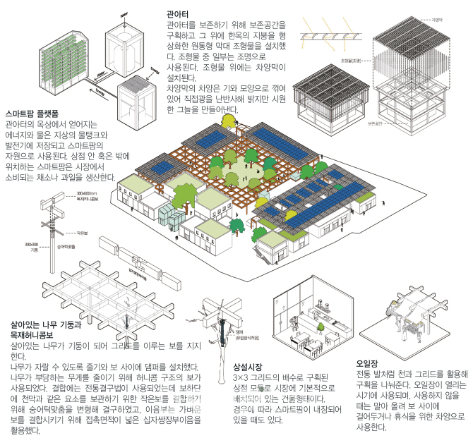 3×3m 사이즈의 기본 모듈을 바탕으로 스마트팜, 상설시장, 오일장, 관아터 등의 확장 모듈이 파생된다. 상설시장 근처에 스마트팜을 배치했으며 몇몇 스마트팜은 건물 내부에 내장되어 있다.