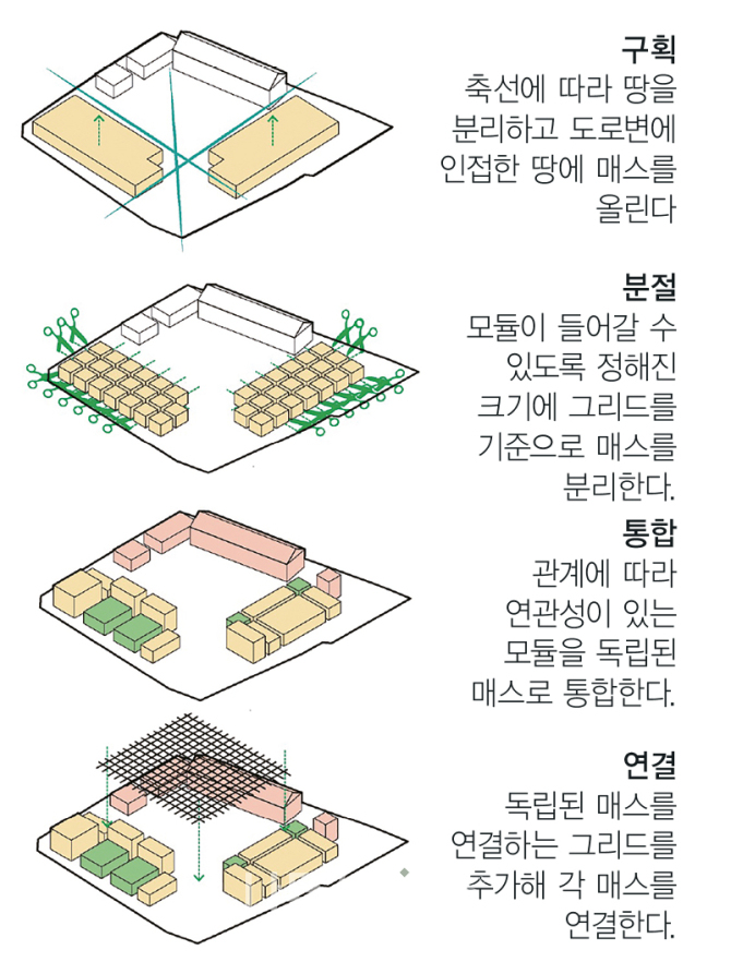 구획으로 보존된 관아터는 뿌리이며 땅의 역사를 대변하고 시장에 문화적 성격을 부여한다. 모듈은 잎이다. 상점, 난전, 관아터, 스마트팜으로 구성되며, 생산과 소비 활동의 무대가 된다. 3×3m의 크기로 대지를 나누는 그리드는 줄기이며 필요에 따라 분리되거나 결합하여 있는 모듈을 하나로 이어준다.