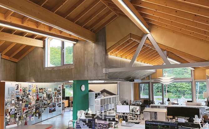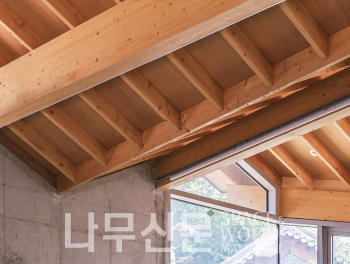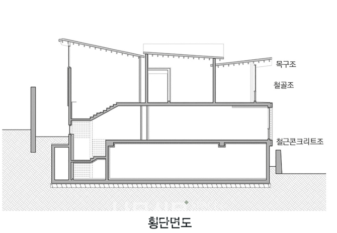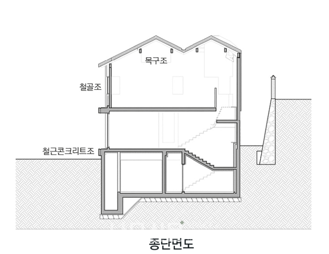 지하와 1층, 그리고 2층 슬라브는 철근콘크리트구조를 이용했다. 반면 2층의 기둥은 철골기둥과 중목기둥을 조합하여 구성했고, 그 위의 지붕은 중목구조가 사용되었다. 층마다 변화하는 기능과 요구에 적합한 구조를 탐구한 결과이다.