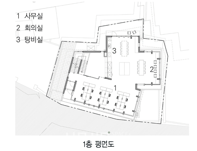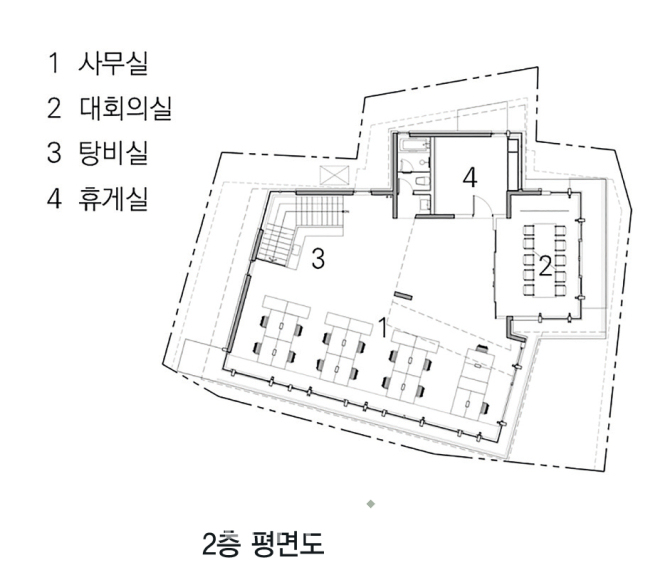 원서동의 가파른 언덕에 건물을 앉혔다. 골목길의 경사는 비원을 향하고, 건축은 비원의 풍광을 건물 측면으로 정면처럼 받아들였다.