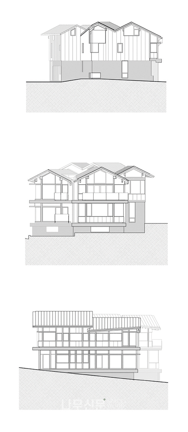 건축은 대지 주변의 여러 경관을 향해 다양한 모양과 다양한 비례의 창을 열었다. 때로는 주변 건물과 높이를 맞추고, 때로는 주변 건물의 시야를 고려하며 소통한다. 서측면과 북측면은 내력벽을 콘크리트로 마감하여 개구부를 최소화했지만, 코너 부분은 모두 개방하여 바깥 풍경으로 향했다. 온전한 지붕과 절반의 지붕이 만나며 비대칭 균형을 이룬다.