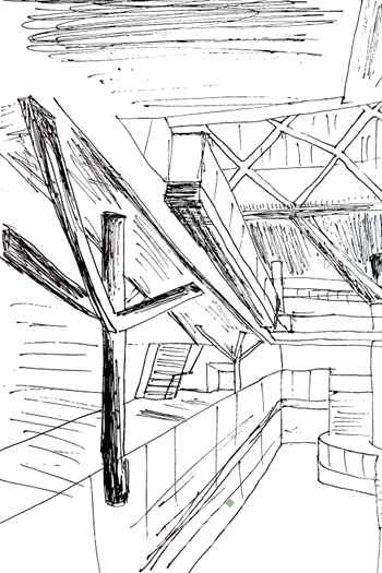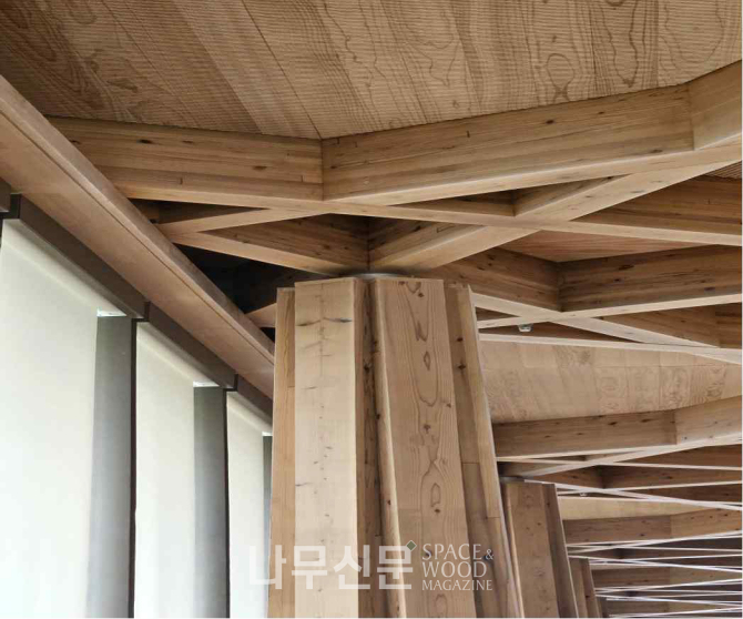 도요타시 시립박물관을 처음 마주했을 때, 박물관이라는 단어가 주는 조용하고 무거운 이미지보다는 오히려 편안하고 투명한 느낌이 강했던 것 같다. 유리와 목재가 조합되어 있는 외관은 주변 자연과 조화를 이루고 있으며 전체적으로 건물이 가볍고 숨 쉬는 듯한 느낌을 받았다. 특히 외부의 나무 기둥 구조가 시선을 사로잡았는데 기둥이 단순히 원형 또는 사각형이 아닌 방사형의 형태를 띄고 있었다. 이러한 기둥의 형태는 그저 기둥이 아닌 하나의 거대한 나무가 자리 잡고 서 있는 듯한 느낌을 주었다. 또 기둥의 하단부에는 콘크리트로 보이는 초석과 같은 것이 있었는데 이 구조체의 외관에도 나무의 질감으로 색을 칠해놓아 하나의 기둥으로 보이게 만들어졌다. 이러한 디테일들을 보면서 건축가의 목재에 대한 강한 신념이 느껴졌다. 기둥을 타고 올라가다 보이면 보이는 천장의 모습은 마치 숲의 한가운데 서서 위를 올려다 보는 느낌을 받았다. 서로 얽히고 교차되어 있는 목재들의 모습은 마치 나뭇가지들이 서로 엉켜 흔들리는 듯한 느낌을 주었다.
