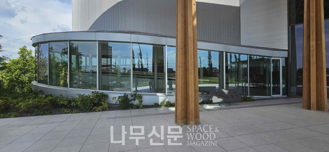 처음 건물을 마주했을 때 가장 인상적인 것이 건물 입면의 형태였다. 사전 조사 때 알아본 내용처럼 마치 바람에 넘겨지는 책의 페이지와 같은 입면은 단순히 디자인적인 것이 아니라 시각적인 깊이감을 주는 동시에 실내로 유입되는 자연광을 조절하고 있었다. 낮고 넓게 펼쳐져 있는 건물은 주변 풍경과 조화를 이루고 있었으며 사방면에 모두 주차장과 출입구가 위치하여 접근성이 매우 뛰어났다.