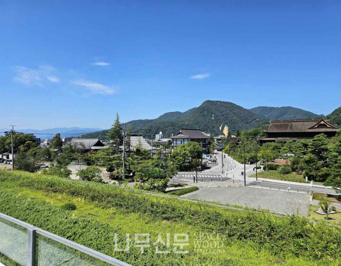 마지막으로 3층의 옥상, 바람 테라스라는 공간으로 올라섰을 때, 젠코지의 본당이 마주 보이고 그 뒤로 산들이 겹겹이 펼쳐진 모습이 선명하게 보였다. 하나의 거대한 풍경화를 보는 듯한 느낌을 받았다. 옥상에는 카페가 하나 위치하고 있었는데 카페에서 보이는 거대한 자연경관이 쉬어가기에 안성맞춤일 것이라는 느낌을 받았다.