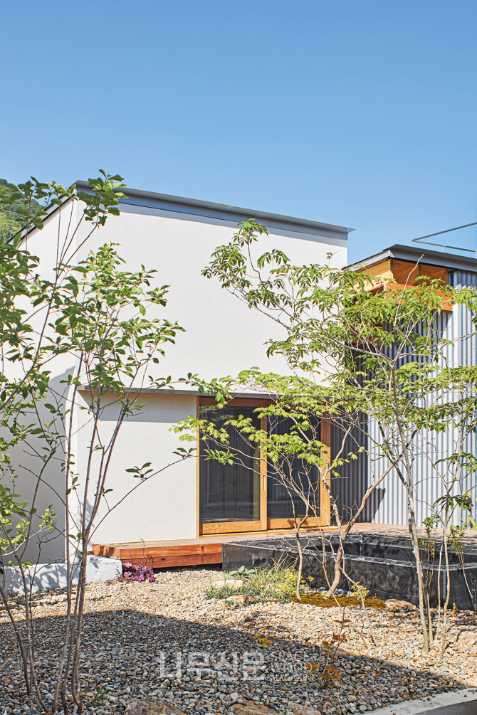 정원은 가든웍스 김원희 대표가 설계했다. ‘저관리형 정원’이라는 전략 아래 유지가 용이한 나무를 중심으로 식재를 최소화했다. 직선과 사각의 건물 매스와 달리 곡선을 가진 수목을 배치해 풍성한 공간감을 만들었고, 동시에 두 집의 프라이버시도 섬세하게 조율했다. /나무신문