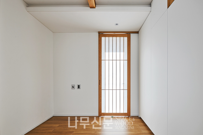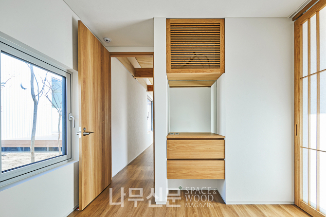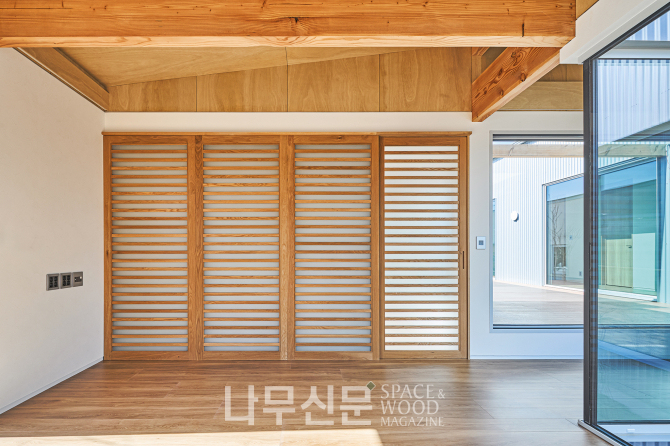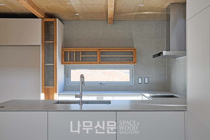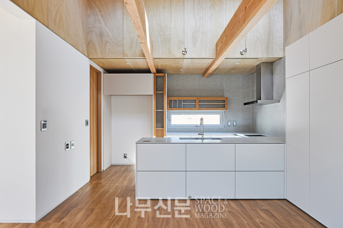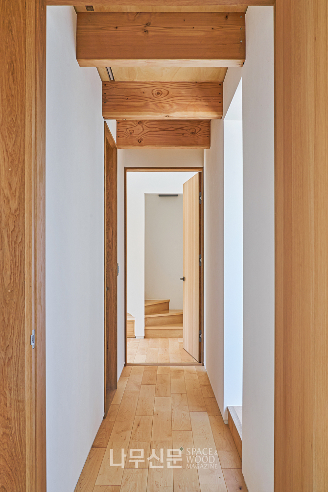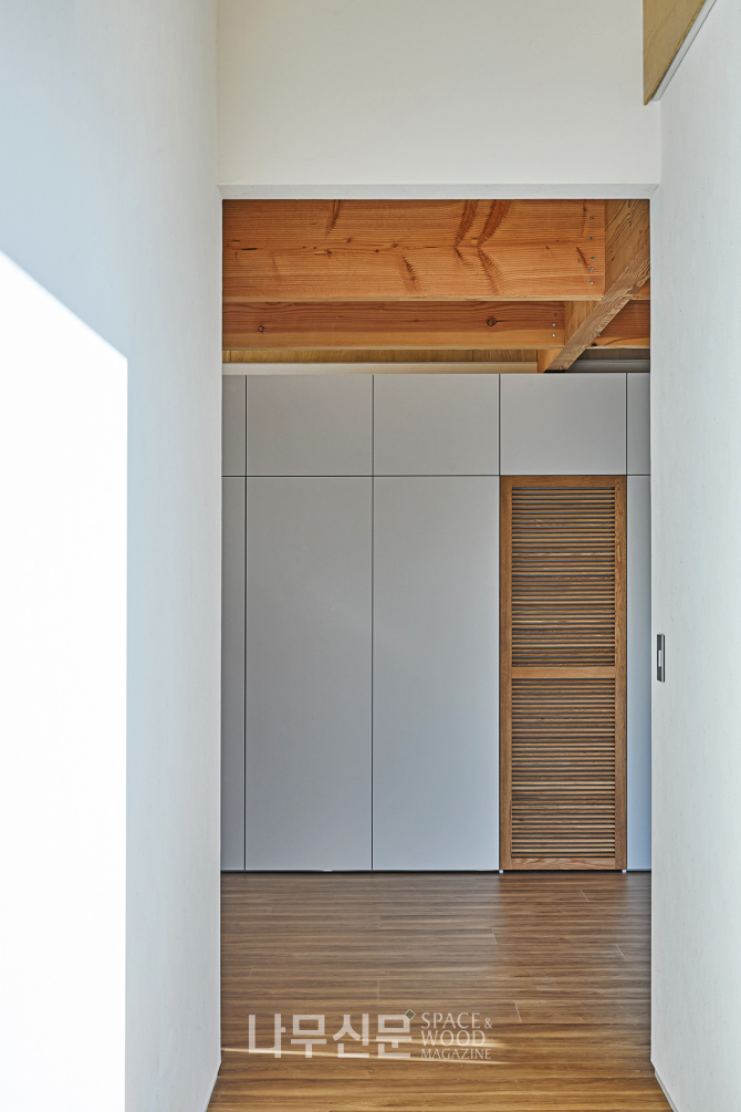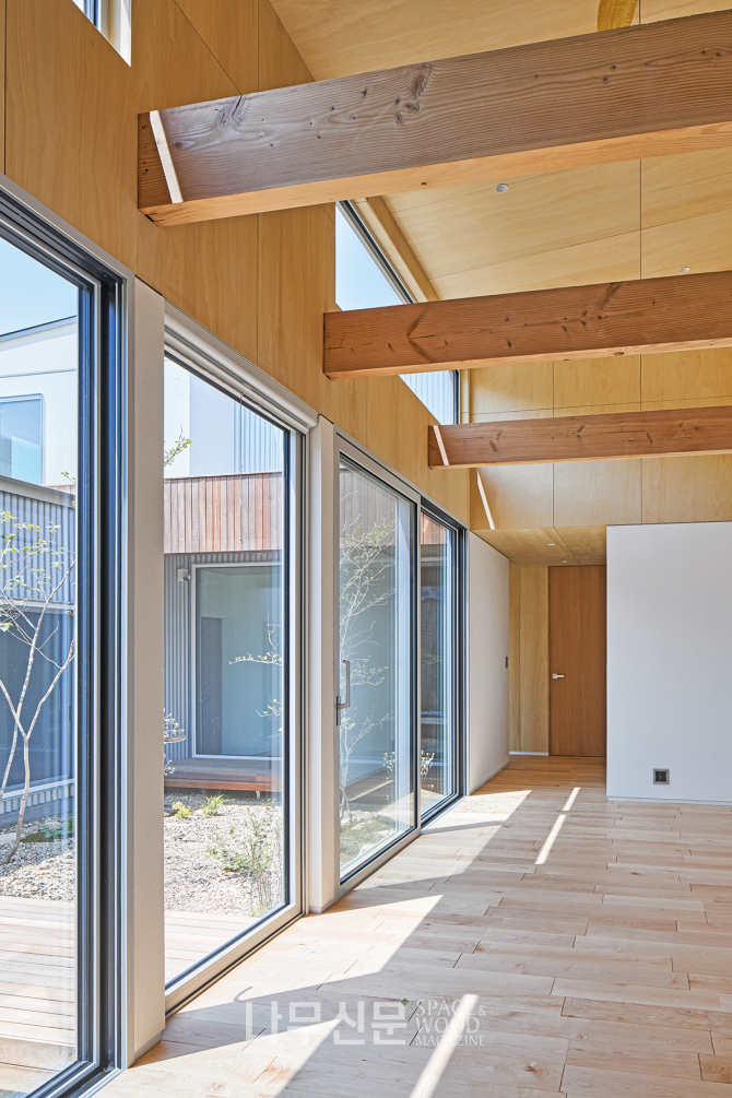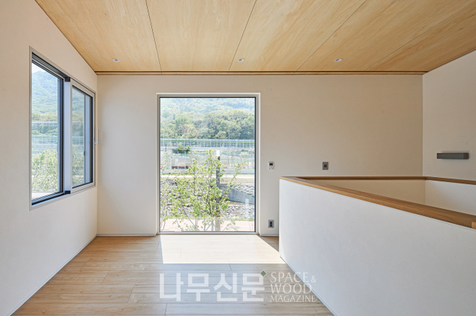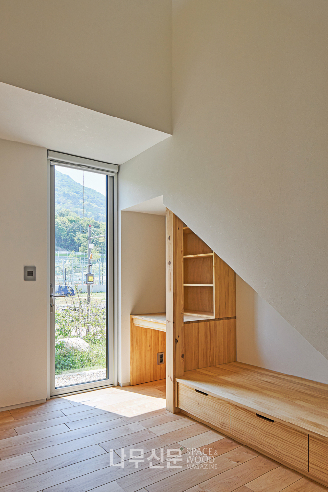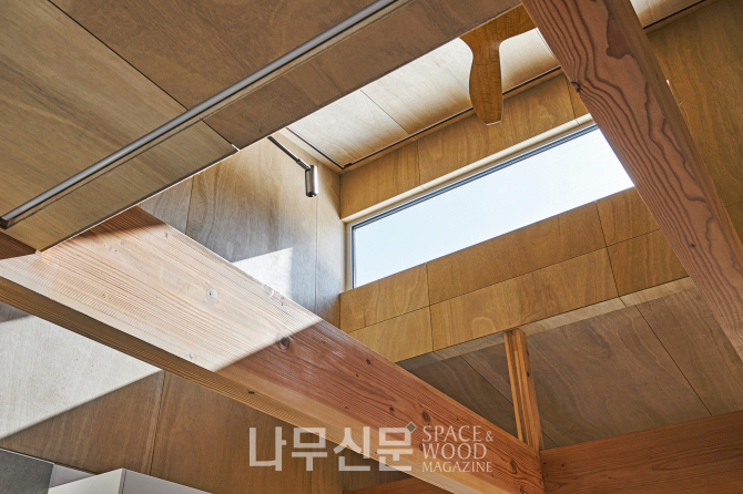 아이방은 복층으로 계획됐다. 1층은 학습과 독서 공간 2층은 금정산 조망을 담은 휴식 공간으로 나뉜다. 또 오동나무 합판으로 마감한 사선 지붕이 따뜻하고 아늑한 분위기를 만든다.