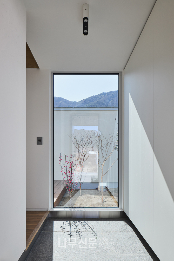 현관에 들어서면 곧장 중정과 연결된 통창이 시선을 바깥으로 이끌며 실내와 외부가 부드럽게 이어진다.