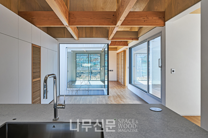 주방과 거실은 작은 정원을 사이에 두고 마주 보도록 배치해 부부가 각자의 공간에 있어도 자연스럽게 서로를 느낄 수 있다. 높은 천고는 공기 순환을 돕고, 공간에 여유로운 볼륨감을 부여한다.