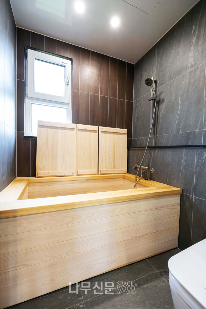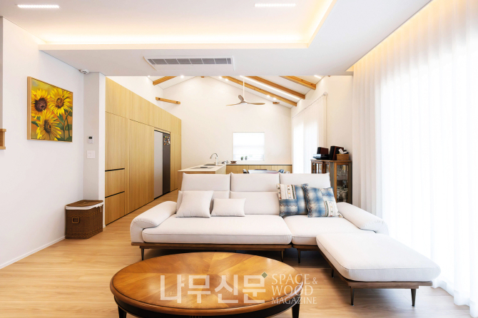 인테리어의 중심은 단순함과 나무다. 모던하고 밝은 화이트 톤 공간에 중목구조의 보와 원목 자재가 포인트처럼 들어섰다. 오픈 천장 아래 드러난 중목 보와 우드 톤 주방 가구는 아늑한 분위기를 연출한다. 다용도실을 숨겨 배치해 공간을 단정히 정리했고 2층 욕실에는 편백 욕조를 들여 생활 속에서 나무 향을 느낄 수 있게 했다.