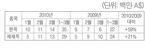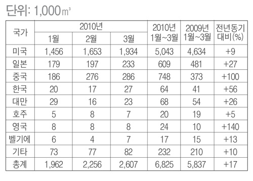- 2010년 1월~3월동안 침엽수제재목 수출은 전년 동기대비 17%가 증가한 583만 7천㎥을 기록하였음.