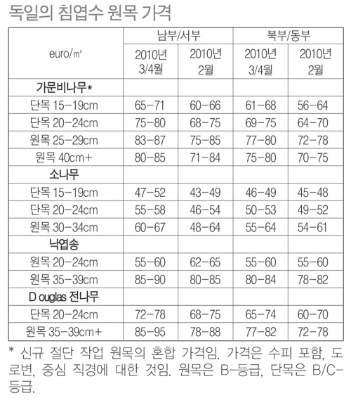 소규모나 중간 규모의 제재소에서 만들어진 목재는 EURO340/m-³EURO345/㎥에 판매되고 있고, 대규모 제재소는 신규계약에 대해