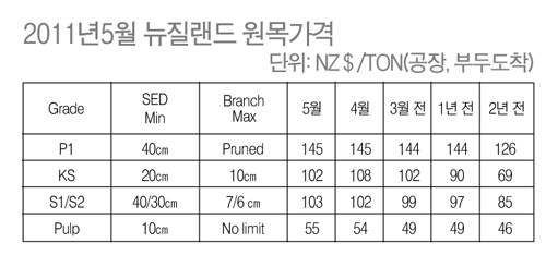 - 일본과 한국시장은 현재 적정한 상태임, 비록 뉴질랜드 원목보다 낮은 가격의 북미 산원목이 한국에서 증가하고 있음.