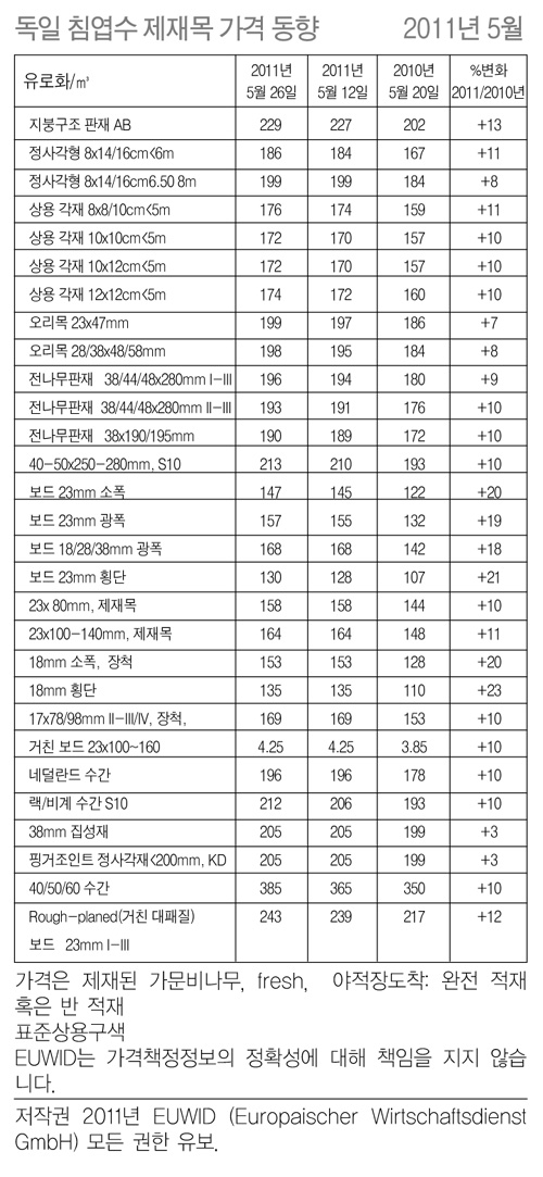 - 일본 대지진 피해 여파로 목제품 수요가 증가할 것으로 전망함.