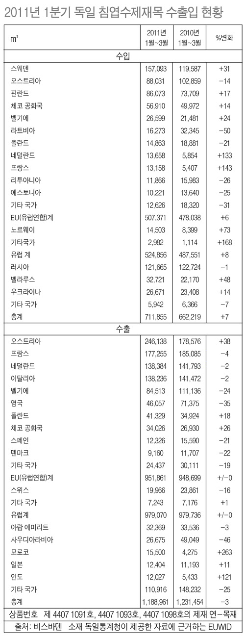 기록하였음, 2011년 1분기 원목 제재목 수입량은 전년 동기 대비 44%가 증가하였음.